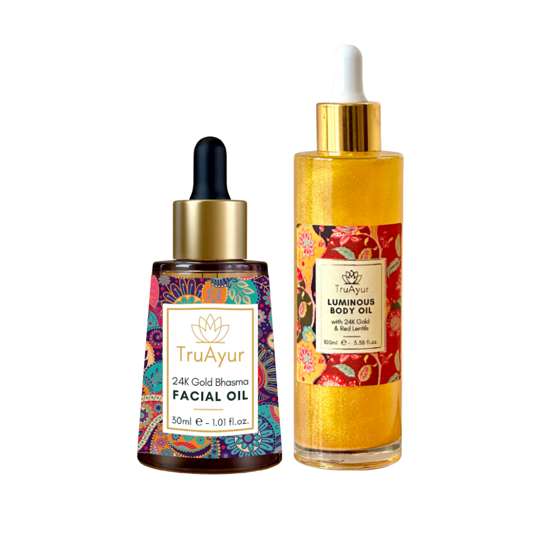 Deze krachtige combinatie is geworteld in eeuwenoude Ayurvedische tradities en bevat 24K Gold Sice Soil, een lichte maar diep voedend elixer dat de huid verheldert, glad maakt en de elasticiteit verbetert, en 24K Gold body Oil, een voedzame mix die diep hydrateert, verstijft en de huid een heldere gouden glans geeft. Met ingrediënten zoals saffraan, kurkuma, ashwagandha en rode linzen verbetert dit duo niet alleen de helderheid, maar versterkt het ook de huidbarrir, vermindert het tekenen van veroudering en egaliseert het de huidskleur, wat zorgt voor een stralende, jonge uitstraling van gezicht tot lichaam.