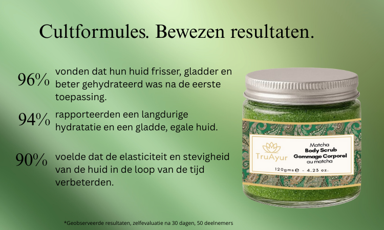 De Matcha-lichaamsscrub is meer dan alleen een scrub – het is een regenererend detoxritueel, geïnspireerd door de wijsheid van Ayurveda en de therapie met groene thee. Matcha is rijk aan antioxidanten en chlorofyl en helpt vrije radicalen te neutraliseren, een doffe huid te laten stralen en een natuurlijke, gezonde teint te bevorderen. Ayurvedische plantenextracten zoals nirgundi, amalaki en gotu kola werken synergetisch om de bloedsomloop te verbeteren, ontstekingen te verzachten en de vermoeide huid te revitaliseren.