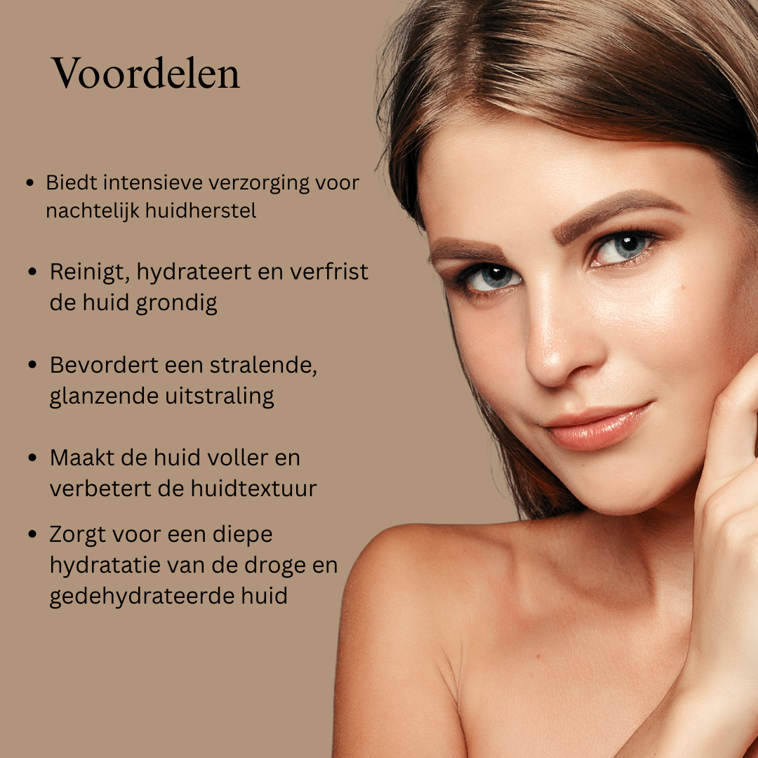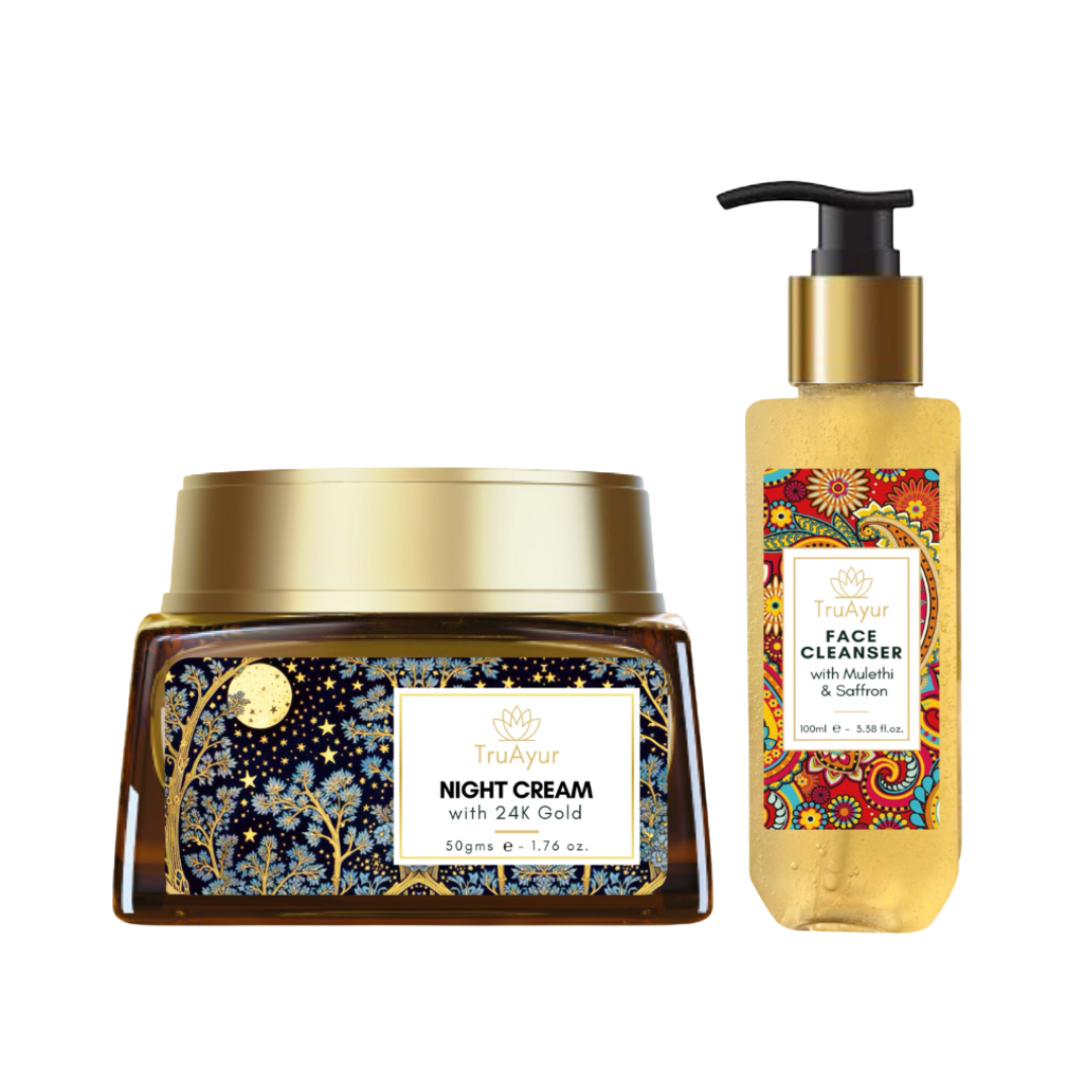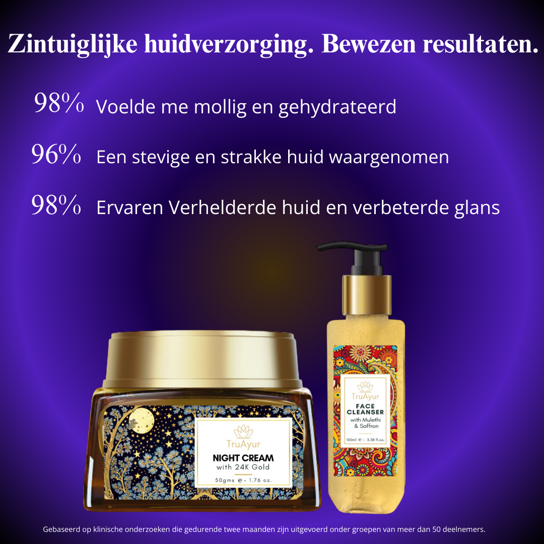 Transformeer je nachtverzorgingsroutine met het Saffron Glow nachtritueel, een luxueus duo dat is gemaakt om je huid te reinigen, te voeden en te ververengeren voor een stralende, gezonde huidskleur. Dit perfecte paar, de 24K Gold gezichtsreiniger en nachtcrème, werkt harmonieus om de huid te ontgiften, te hydrateren en te herstelen terwijl je rust.