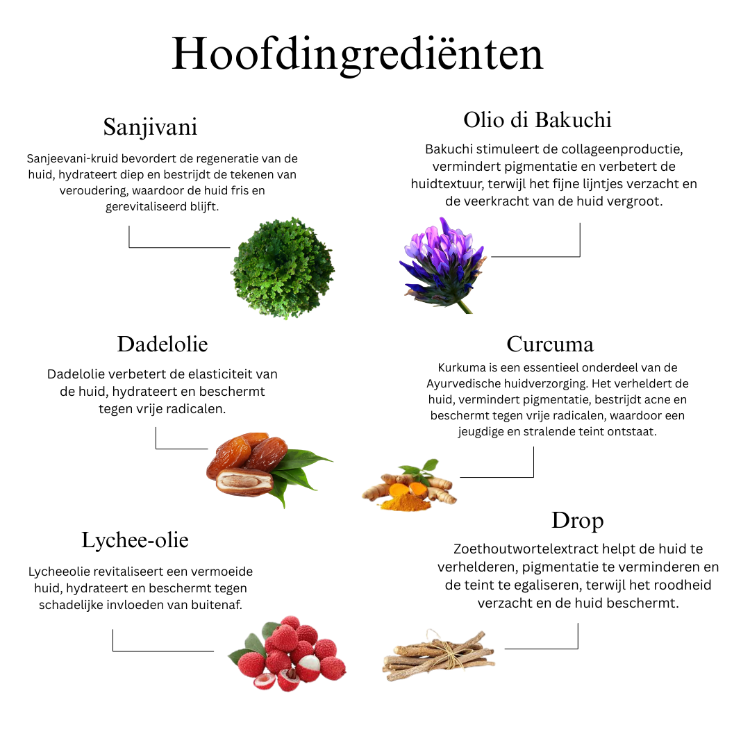 Sanjeevani Amrit Facial Oil is een traditioneel en uniek ayurvedisch elisir verrijkt met het kostbare Sanjeevani-kruid en vele andere krachtige botanische producten om de eerste tekenen van vergrijzing te bestrijden en pigmentatie te verminderen. Dit luxe preparaat voedt de huid intensief, waardoor de textuur wordt en de natuurlijke helderheid wordt hersteld. Deze ayurvedische revitaliserende olie maakt gebruik van de kracht van zeldzame en krachtige kruiden, waarvan er veel worden gewaardeerd om hun regeneratieve eigenschappen, maar niet vaak worden gevonden in het Westen. De formule werkt holistisch voor een helderdere, egalere teint en een verjenging van de huid die vitaliteit uitstraalt. Door oude Ayurvedische wijsheid te combineren met moderne wetenschap, biedt Sanjeevani Facial Oil een revolutionaire oplossing voor huidverzorging en biedt het een revolutionaire ervaring die de huid van binnenuit verjongt en revitaliseert.