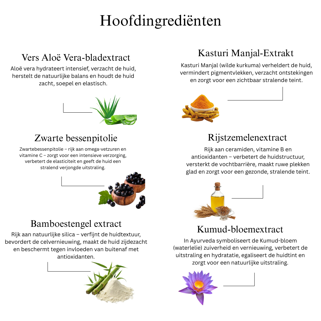 Manjistha werkt als een natuurlijk detoxmiddel, reinigt en egaliseert de teint, terwijl aloë vera en kumudbloesem de huid kalmeren en intensief hydrateren. Bamboestam-extract verfijnt de huidtextuur en ondersteunt de huidvernieuwing, en tarwekiemolie zorgt voor een extra boost aan vitamines en antioxidanten voor langdurige soepelheid.