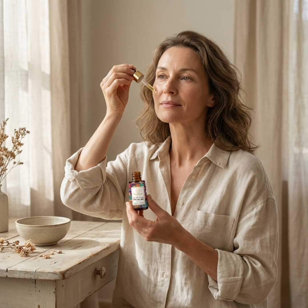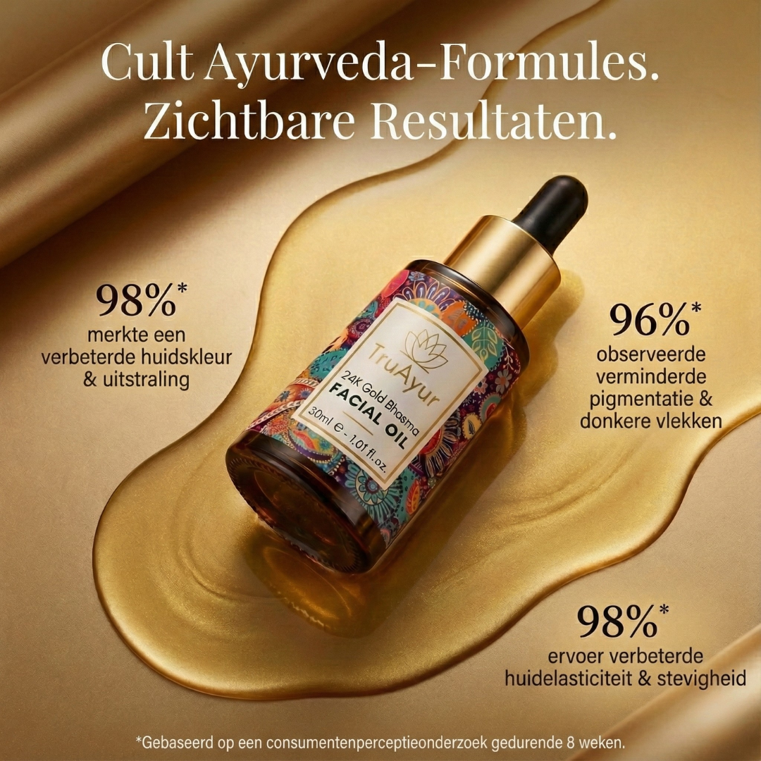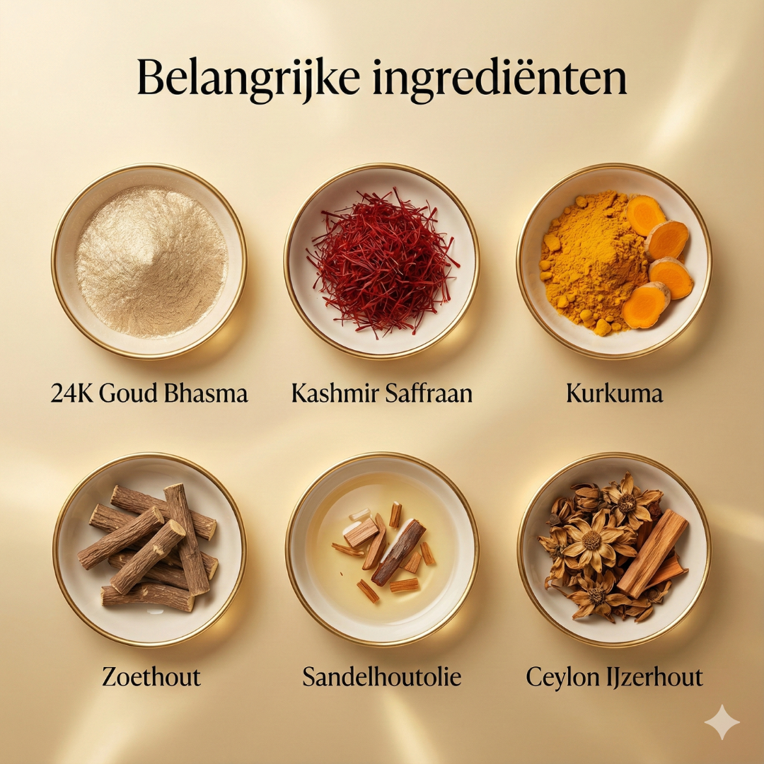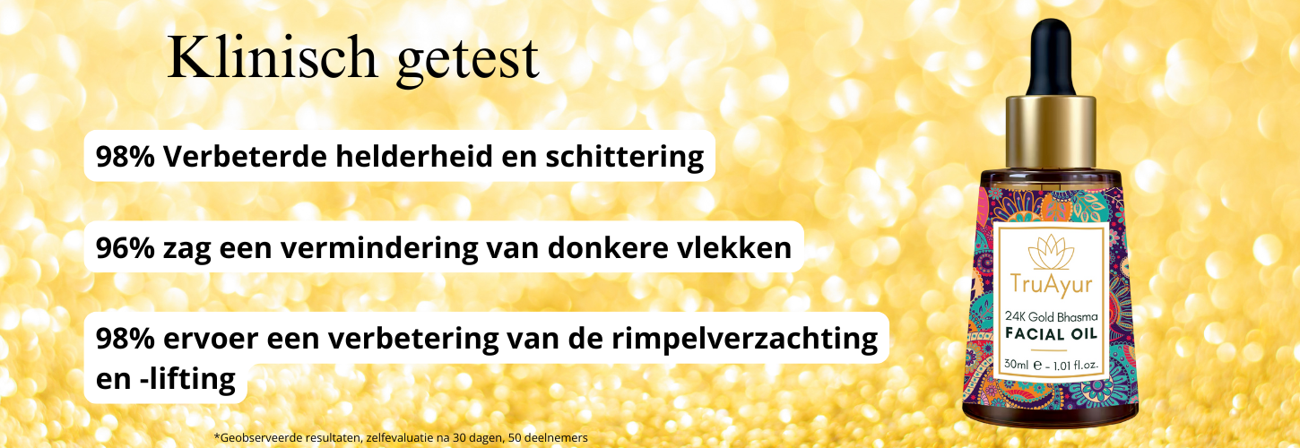 24K Gold Bhasma Facial Oil is een traditioneel en uniek ayurvedisch elixer met kostbare kruiden en 24-karaats goud, dat helpt de eerste tekenen van veroudering te verminderen en pigmentatie te verlichten. Dit buitengewone preparaat voedt de huid en helpt de huidtextuur te verbeteren. Het Ayurvedic Radiance Elixir maakt op verschillende manieren gebruik van de kracht van zeer effectieve kruiden die in het Westen niet gemakkelijk verkrijgbaar zijn, om een heldere, gelijkmatige teint en een gouden gloed te ondersteunen. Door inzichten uit de moderne wetenschap te combineren met 5.000 jaar oude ayurvedische recepten, ervaar je de transformerende kracht van deze formule voor een stralende, gouden huid.